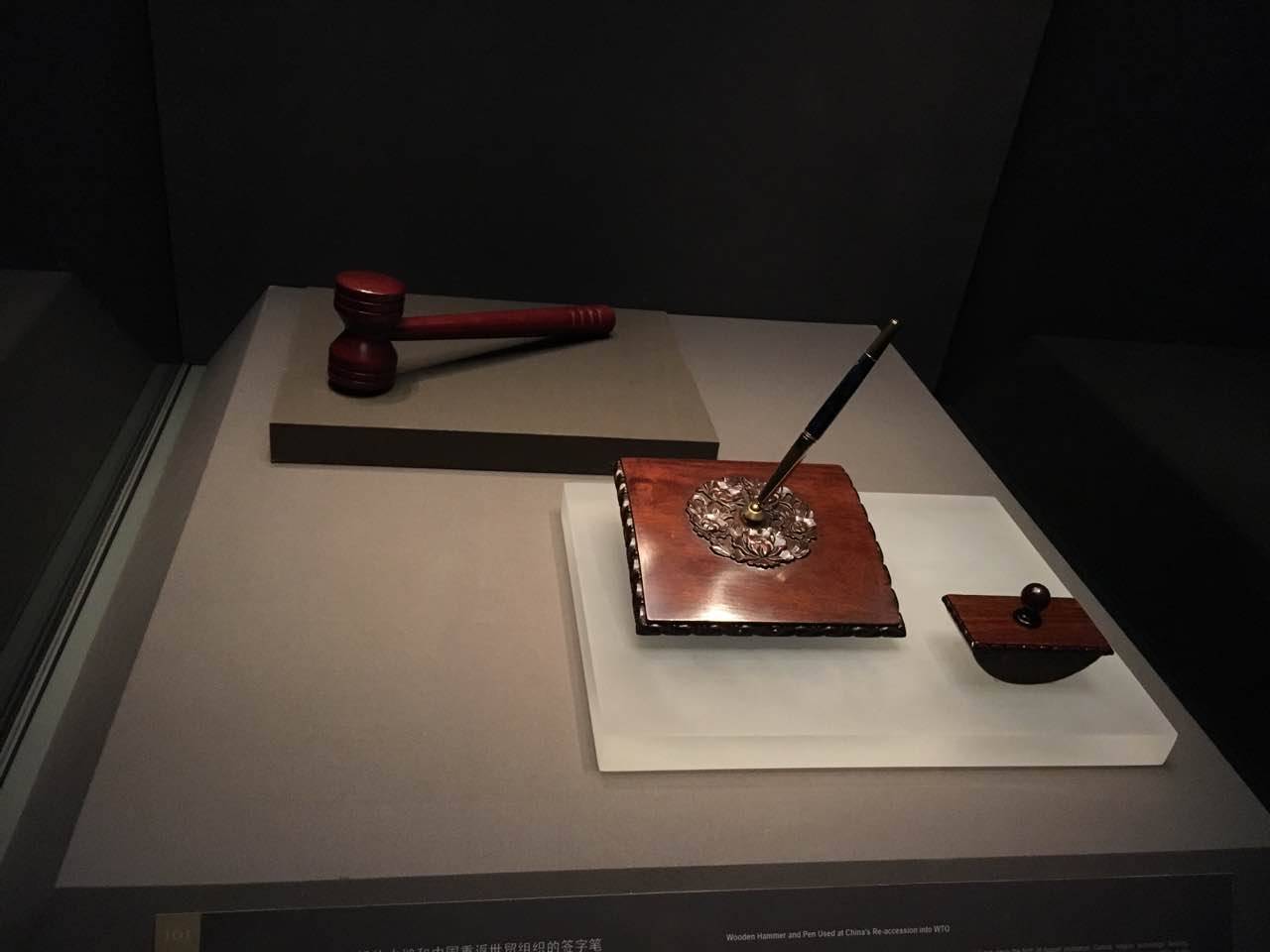 为了体现巡展地与展览本身更强的互动性和契合度■,该展览的策展方式也颇为新颖,即在每个巡展地区,合作举办方都要为这部世界史增添一件能够代表社会当下进程的物品,这也就是展览现场的“第101件(套)展品”,它将展览的触角由过去、现在延伸至对将来的思考-=-。而此次在中国展出,中国国家博物馆也照例挑选了一套具有特殊意义的展品——-●○“2001年宣布中国重返世贸组织(WTO)的木槌和中国重返世贸组织的签字笔=◆”,这在体现中国时代特征的同时☆■,也在回应着展览的主旨即▼“全球化是人类内在需求”。