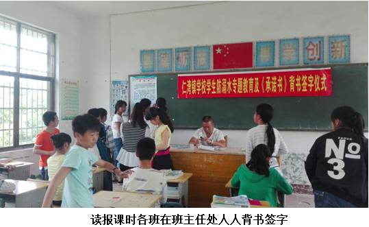 近日,该校除了按教育局开展防溺水“六个一”规定动作外(挂一张图、唱一首歌、发一封信、看一次专题片、上一次课、写一篇观后感),特增加一个“狠”动作:要求每个学生对《仁湾镇学校学生防溺水“六不”承诺书》到班主任处背书签字。活动过程是:在大课间操上,全校举行背书签字仪式,各班代表在国旗下背书签字;在读报课上,学校给每个班级教室黑板左边贴上一张永久性的《学生防溺水“六不”承诺书》,学生先集体背书,再人人到班主任处过关背书,最后个个在《承诺书》上用记号笔签上自己的名字。这一活动给学生思想上很大的震憾,极大的提高了学生防溺水安全意识。(蒋剑中)