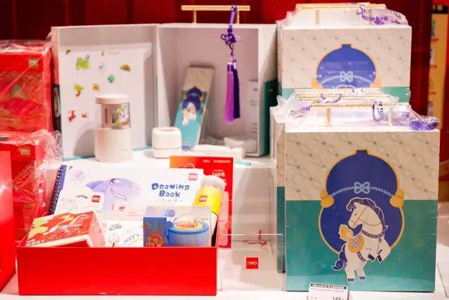 跟国民级动画电影《哪吒之魔童闹海》联名推出的哪吒文具礼盒套装、立体橡皮指环、mini零钱包等制品,其中混天绫配色的中性笔笔锋凌厉,毛绒笔袋上的哪吒眉眼灵动,仿佛要跳出文具直奔新春庙会,受到全年龄段的喜爱。